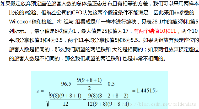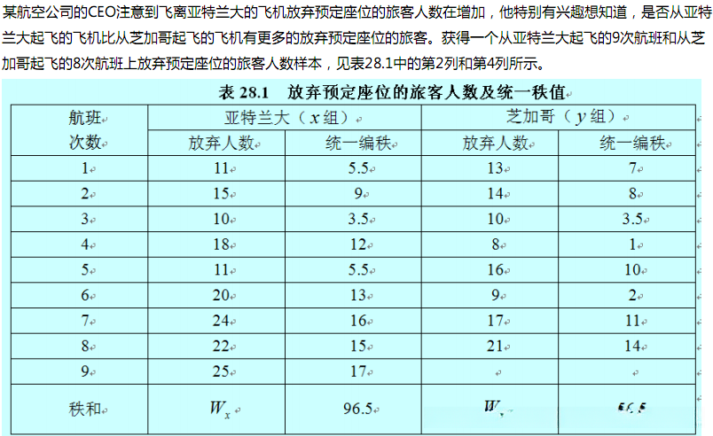 Wilcoxon秩和检验是基于样本数据秩和。先将两样本看成是单一样本(混合样本)然后由小到大排列观察值统一编秩。如果原假设两个独立样本来自相同的总体为真,那么秩将大约均匀分布在两个样本中,即小的、中等的、大的秩值应该大约均匀被分在两个样本中。如果备选假设两个独立样本来自不相同的总体为真,那么其中一个样本将会有更多的小秩值,这样就会得到一个较小的秩和;另一个样本将会有更多的大秩值,因此就会得到一个较大的秩和。