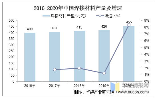 中国是焊接材料行业生产和消费大国。近年来我国焊接材料产量稳中有升,根据中国焊接协会数据,2020年我国焊接材料产量为455万吨,同比增长8.33%。