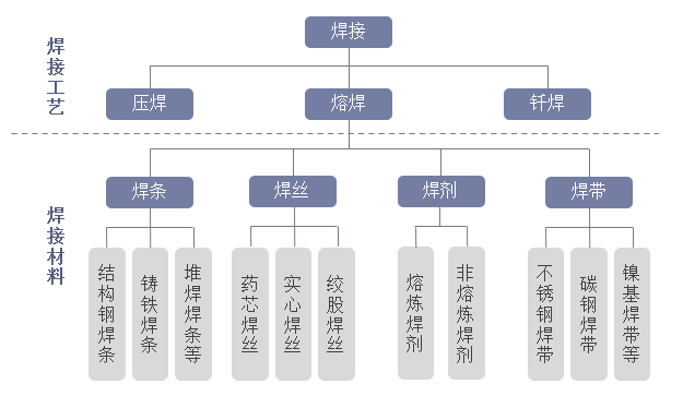 焊接材料是指焊接时所消耗材料的通称,例如焊条、焊丝、金属粉末、焊剂、气体等。根据焊接工艺的区别,焊接材料的分类差别较大,具体划分如下: