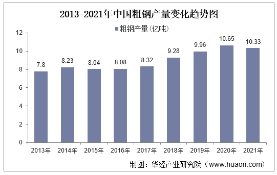 2013-2021年中国粗钢产量变化趋势图