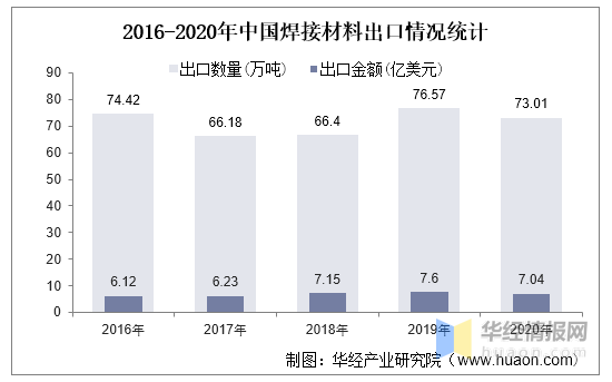 我国焊接材料出口数量从2016年的74.42万吨变动至2020年的73.01万吨,出口额从2016年的6.12亿美元增长至2020年的7.04亿美元,总体呈现增长趋势。