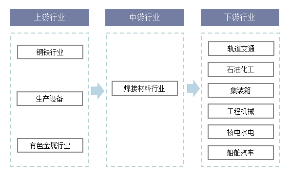 焊接材料是钢铁的“缝纫线”和“黏合剂”,其上游行业主要是钢铁、有色金属及焊材生产设备等行业。焊接材料行业下游主要包括轨道交通、石油化工、集装箱、工程机械、核电水电、船舶汽车等多个领域。