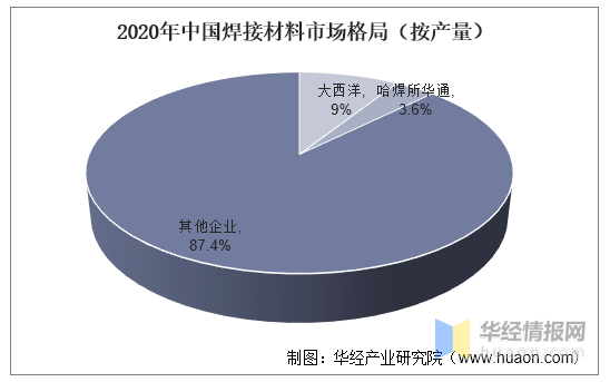 国内焊接材料市场集中度较低,提升空间大。从2020年企业焊接材料产量来看,大西洋市场占比9.0%,哈焊所华通市场占比3.6%。