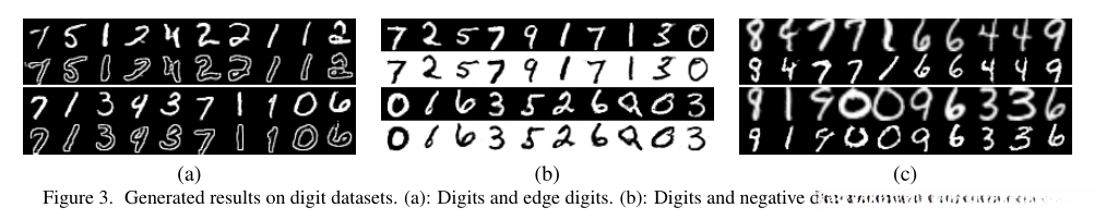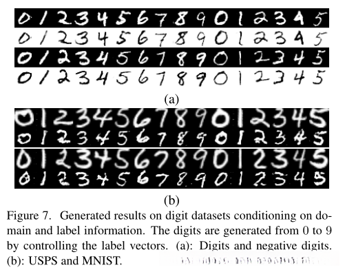 我们将针对多种信息提出的模型条件应用于两个任务。 MNIST数据集用于第一个任务,其中源域和目标域分别是数字和负数字。 第二项任务是在USPS数字和MNIST数字之间。 训练期间仅使用源域的标签信息。 通过控制标记向量,我们可以生成0到9之间的数字,其结果如图7所示。我们有以下两个观察结果。 首先,图7中的配对图像高度相关。 其次,我们能够通过调整标签向量来控制生成的目标域数字的类别。