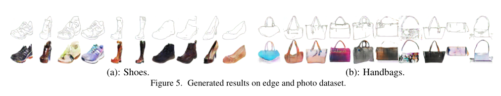 另一个评估是在手袋[20]或鞋子[18]的边缘图像和逼真的照片之间对齐。 图5显示了生成的分辨率为64×64的结果,我们可以观察到AlignGAN学会了成功地在边缘和真实照片之间对齐。