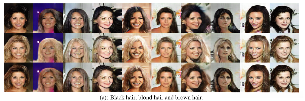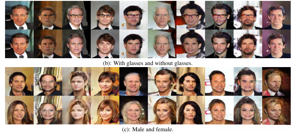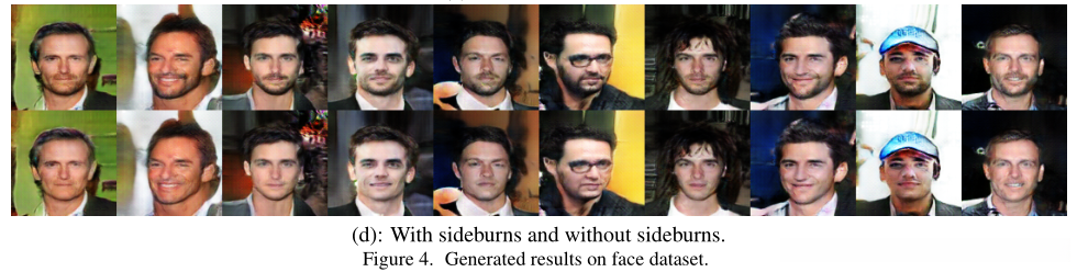 我们还将在CelebFaces Attributes数据集[10]用于该实验的面部图像上评估AlignGAN。 我们研究了以下四个任务:1)不同颜色的头发之间的对齐; 2)戴眼镜与不戴眼镜之间的对准; 3)男女对齐; 4)有side角的雄性和没有without角的雄性之间的对齐。 结果显示在图4中,其中生成的图像的分辨率为112×112。