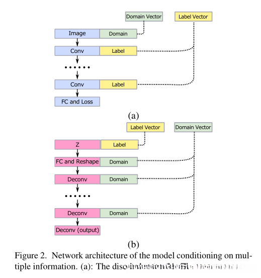 首先,对于生成器,噪声输入层不应受域矢量限制。 因为模型应该为不同的领域学习相同的最高层语义。 对于生成器的其他层,它们应以域向量为条件。