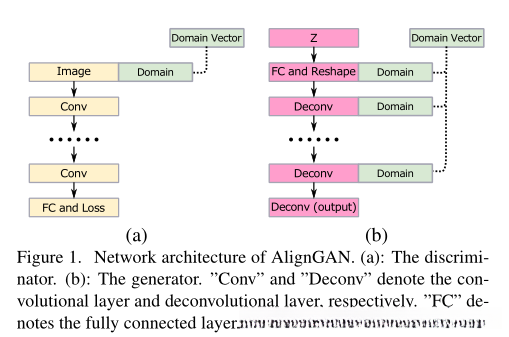 图1. AlignGAN的网络架构。 (a):判别器。 (b):生成器。 “ Conv”和“ Deconv”分别表示卷积层和反卷积层。 “ FC”表示完全连接的层。