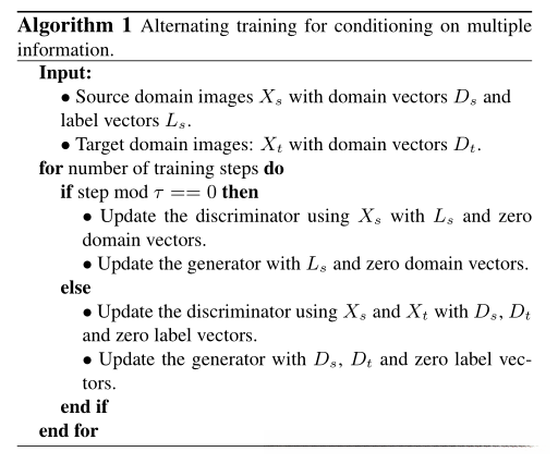 两步交替训练。 我们采用两步训练算法,通过交替优化来学习特定领域的语义和共享标签的语义。 在第一步中,我们利用带有标签向量的源域图像来学习标签语义,并将域向量设置为零向量。 在第二步中,我们利用源和目标域图像以及域向量来学习特定于域的语义,并将标记向量设置为零向量。 训练过程在算法1中正式提出。请注意,超参数τ用于调整领域语义和标签语义之间的训练迭代分配。 在我们的实验中,我们设置τ= 4。