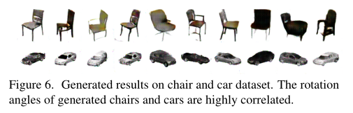 根据文献[7],我们还研究了对齐椅子[2]和汽车[4]的图像的任务,以研究AlignGAN是否能够了解两个不同域之间的旋转关系。 如图6所示,生成的椅子和汽车的旋转角度高度相关。