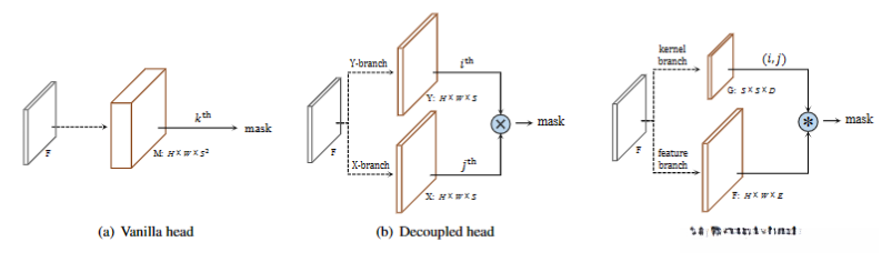重点看一下Mask Branch,每个正样本(有类别输出的网格)都会输出对应类别的instance mask,这里的通道channel和网格的对应关系是:第k个通道负责预测出第(i,j)个网格的instance mask,k = i*S+j。因此输出维度 是H×W×(S^2) 。这样的话就有了一一对应的语义类别和class-agnostic的instance mask。