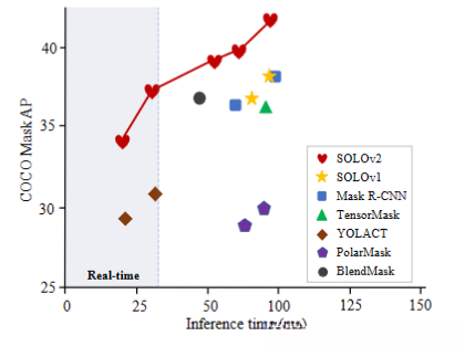 SOLO v2遵循了SOLO的优雅、简单的设计,并且针对mask的检测效果和运行效率做了两个改进:(1)mask learning:能够更好地学习到mask(2)mask NMS:提出了matrix nms,大大减少了前向推理的时间。 最终,SOLOv2相比SOLOv1,AP提升1.9%的同时速度快了33%,light-weight 版本的SOLVv2能够在COCO上达到31.3FPS,37.1%AP。除此之外,SOLO v2还在目标检测和全景分割任务中表现上佳,证实了SOLO的思路有用在更多视觉任务的潜力。