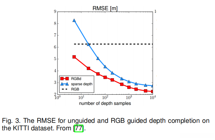 具有两个显著的优点。无引导方法不仅对光线或天气变化的环境表现出更高的鲁棒性(它们仅采用稀疏深度图作为输入),同样地,在计算上更为高效(因为同样的原因)。然而,在缺少语义信息以及深度点分布不规则的情况下(即未利用图像中的额外无监督损失),其性能较弱(如表3所示)。[73]这一最佳方案也采用了RGB图像来进行模型训练。相比之下,在训练与推理阶段均未使用RGB图像的最佳方案是[48](RMSE为937.48)。另一方面(如表4所示),最佳RGB引导方案DySPN表现更为出色(RMSE仅为709.12)。值得注意的是,在所有监督学习条件下使用的RGB引导方案都显著优于HMS-Net(包括除以下几种外的所有其他方案:3coef[51]、EncDec-Net[EF][112]、Morph-Net[17]以及CSPN[13])。这一差异主要源于未利用来自图像中额外的无监督损失所带来的优势。