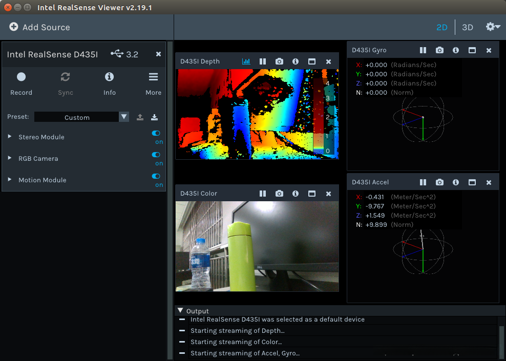 - D435i (D435上集成了IMU 网上说是6DOF 博世BMI055?) SDK:librealsense 2.19.1