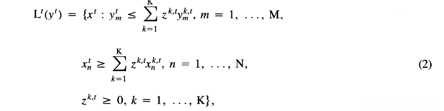 式(2)的约束条件体现了规模报酬不变性和投入产出的可自由组合性。对于K个观察对象的投入情况,做一个线性组合,那么就能得到相同线性组合后的产出。比如,A一小时能种10棵树,B一小时能种5棵树,那A和B一起一小时就能种15棵树,两小时就能种30棵树(规模报酬不变,不会因为疲惫减少产出)。而A和B三小时种30棵树、两小时种25棵树的情况都是在既定技术范畴内,是合理的,这也就是≥和≤的含义。