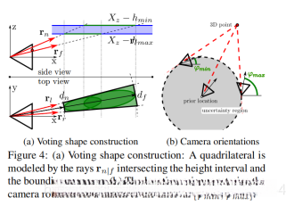 通过以下三步得到O(n)的时间复杂度。首先,给定旋转角度,对所有n个对应关系的单次迭代足以聚合2D摄像机位置的投票。第二,在判别摄像机角度时,需要对k个离散角度分别执行该过程。第三,为了相机高度的大变化以及传播的不确定性导致导致较少的判别性投票,作者还将量化的高度范围量化为1个较小的间隔,并对每个间隔进行测试。也就是说对于多个匹配对,都这样构建一个Voting Shape,所有的这些Voting Shape 重叠部分最多的就是相机最有可能的位置。