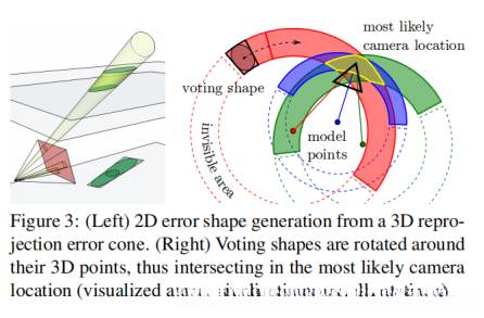 因为在空间中,3D 点的位置是已经确定的,所以把 error shape 转换到相机的位置上,这样的话相机可能的位置就不再是只在一个圆的边上了,而应该是在一个圆环内。对于每一个2D-3D匹配对,都可以构建出这样一个圆环区域表示相机可能的位置,如果所有2D-3D匹配关系都考虑,得到相交最多的位置就是相机最有可能的位置了,如图4(右)所示黄色局域。