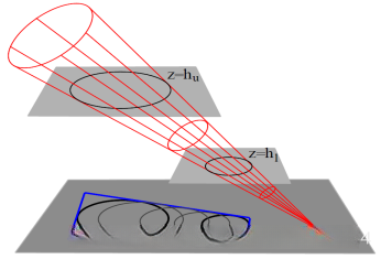 结合公式2,配准问题进一步限制在偏移X_z-h,即C的圆锥部分c_x(x,r)=X_z-h,因为相机的高度不确定,有一个变化的区间[h_{min},h_{max}] ,那么3D点相对于光心的高度变化范围就是,这时3D点就会落在相对光心的高度为[h_1,h_u]的两个平面截取error cone 所得到的立体中。如果把此时的立体和3D点都投影到水平面上,会得到上图中蓝色梯形所示区域,3D点也应该在蓝色梯形中。把蓝色区域和图3表示的四边形称为error shape。