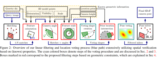 在该文中作者指出,随着模型尺寸的增加,在场景模型中查找查询图像特征和3D点之间的正确2D-3D匹配变得更加困难。与基于外观的滤波相比,作者研究了的空间验证的好处和局限性,并且作者提出了一种基于投票的姿态估计策略,比之前的方法能获得更多的匹配,在匹配数量方面呈现了O(n)的复杂度。
