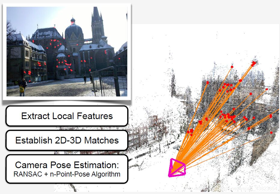如上图所示,右边是场景的点云模型的一部分,左上角是查询图像, 基于图像的定位就是要求得对应的相机的位置和姿态(点云中红色锥形表示了相机的位置和朝向)。
