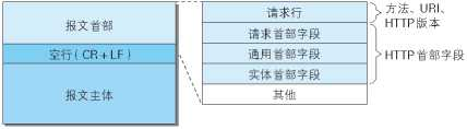 在请求中, HTTP 报文由方法、 URI、 HTTP 版本、 HTTP 首部字段等部分构成。