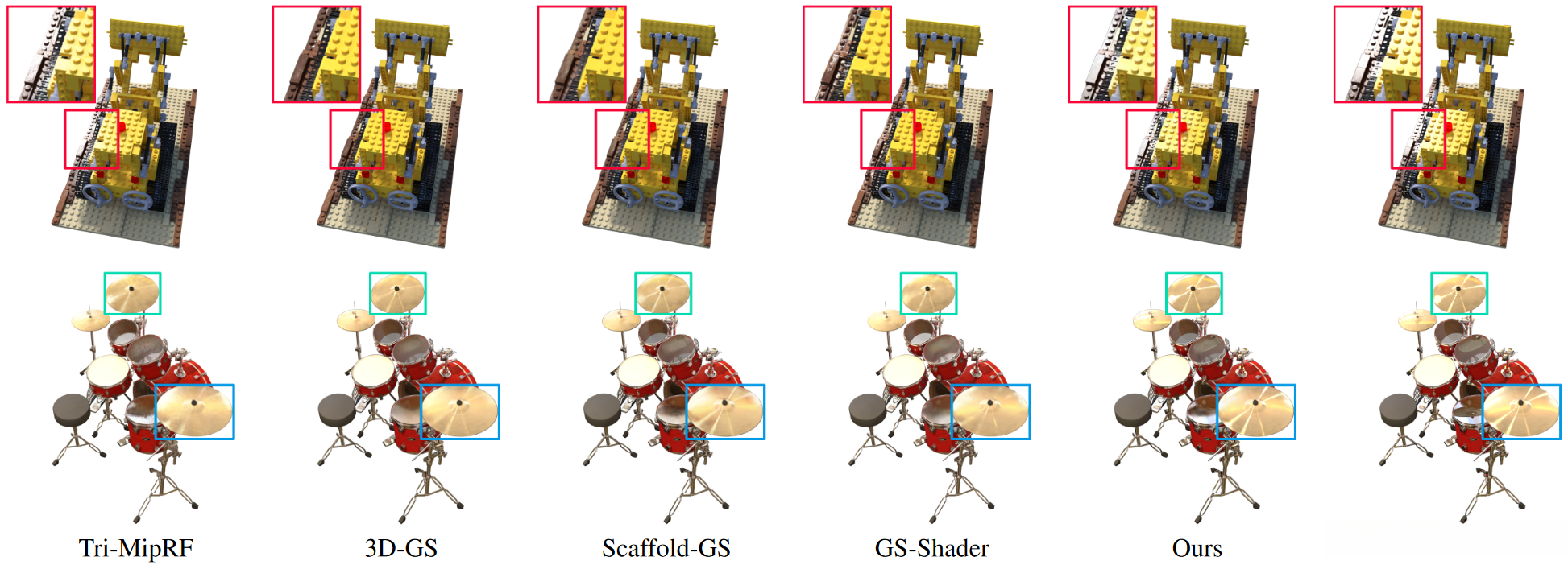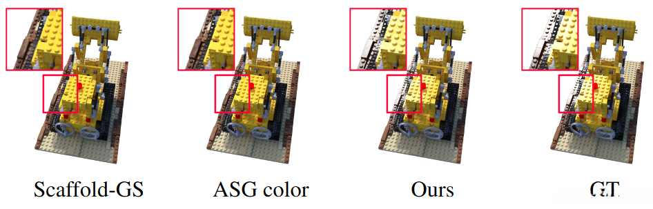 We have demonstrated the superiority of our method compared to 3DGS and scaffold-GS, which models color based on MLP.