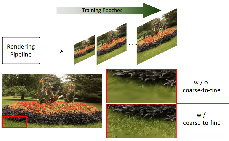 Additionally, we have developed a coarse-to-fine training strategy to improve learning efficiency and eliminate floaters caused by overfitting in real-world scenes.
