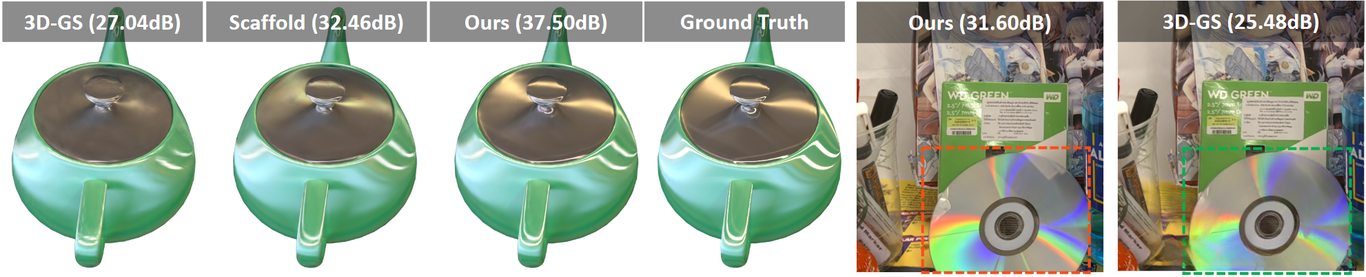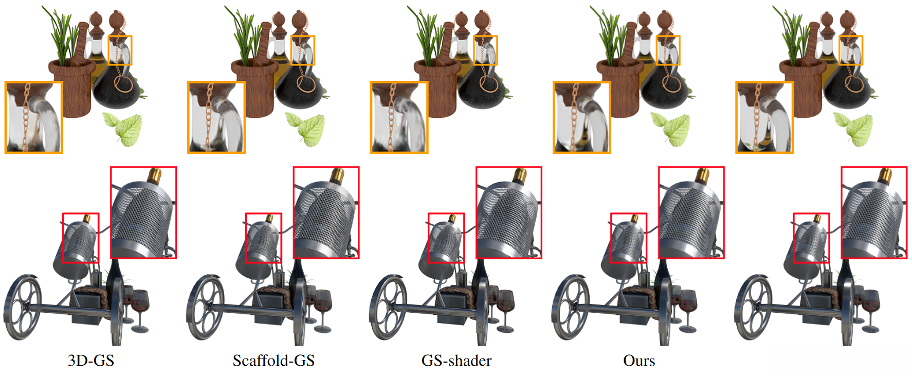 Our method significantly improves the ability to modelmetallic materials compared to other GS-based methods. At the same time, our method also demonstrates the capability to model refractive parts, reflecting the powerful fitting ability of our method.