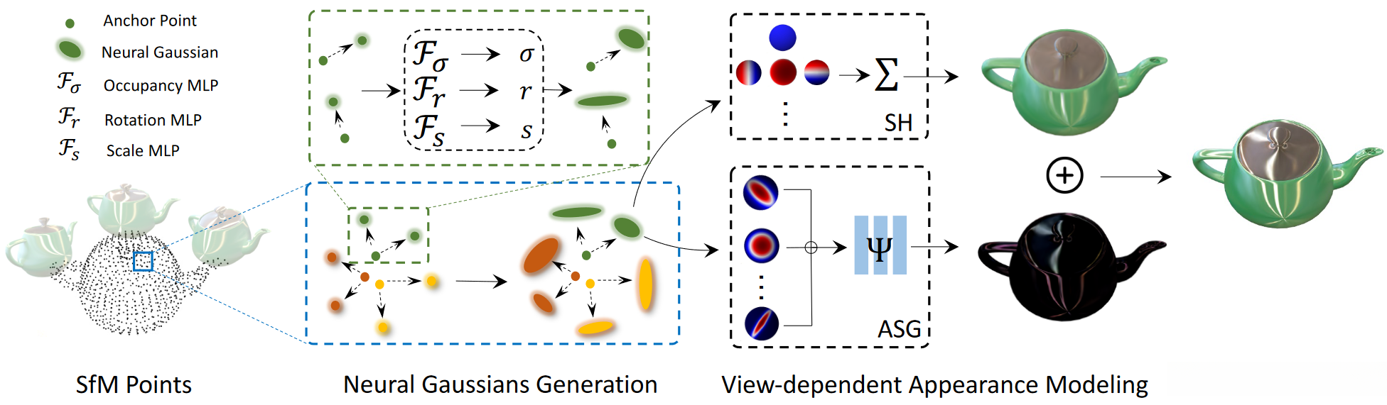 To address thelimitations oflow-order SH and pure MLP in modeling high-frequency information , we additionally employ ASG in conjunction witha feature decoupling MLP to model the view-dependent appearance of each neural Gaussian.