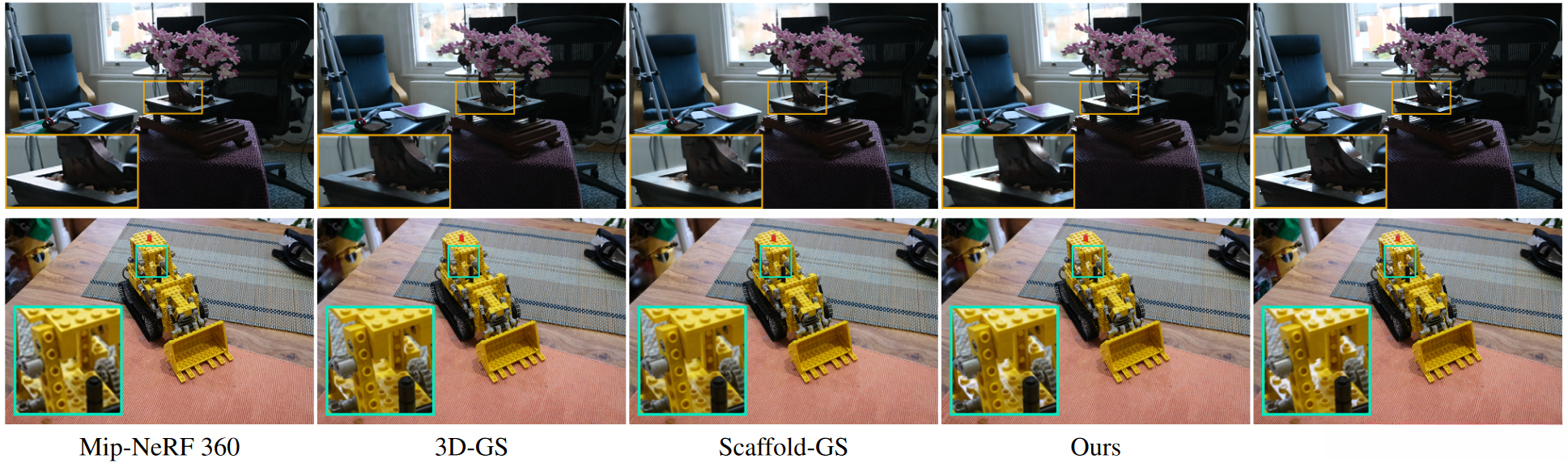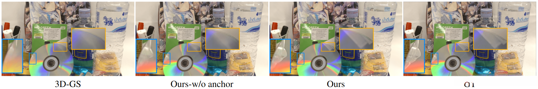 The shiny scene is borrowed from Nex. This clearly demonstrates that anchor Gaussians can improve the geometry of 3DGS. Consequently, this enhancement aids in its ability to learn the reflective parts of the scene, as highlighted in the orange and blue boxes.