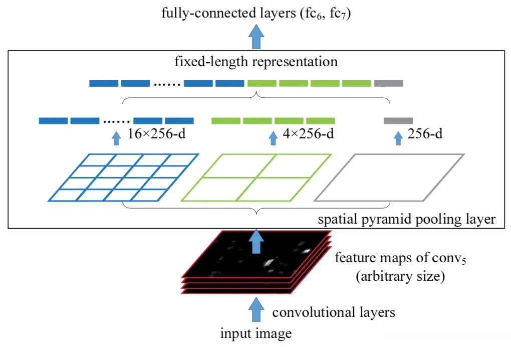 SPP层 如上图,位于最后一个卷积层(conv5)与全连接层之间。黑色图片代表卷积之后的256个特征图,256-d代表卷积层conv5的层数,接着我们以不同大小的块来提取特征,分别是44,22,1*1,将这三张网格放到下面这张特征图上,就可以得到16+4+1=21种不同的块(Spatial bins)。