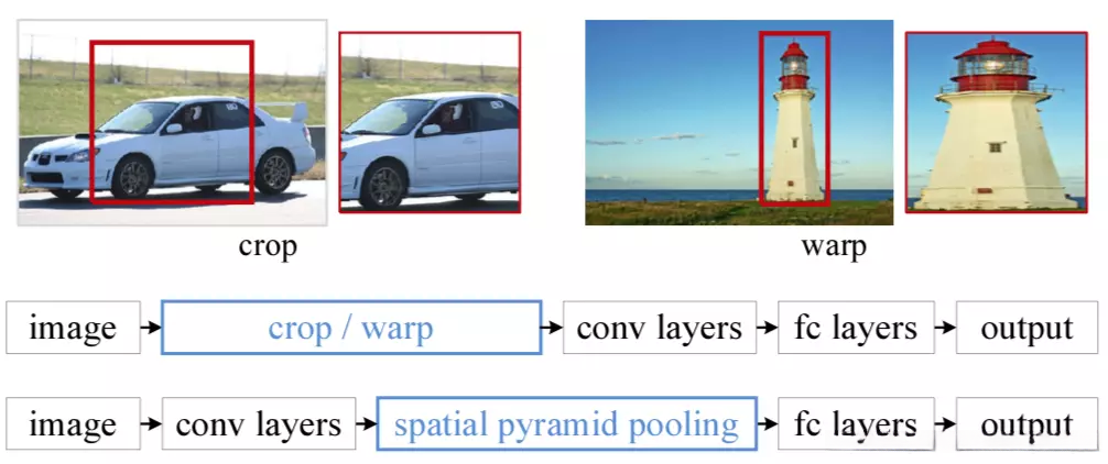 SPP-net 的处理方式:不固定图像的大小,直接输入给卷积层处理,卷积出来的特征并不是直接输入给全连接层,而是在spatial pyramid pooling layer提取各个region proposal的特征(具体过程见下段),然后得到一个固定长度的输出传给全连接层,最后输出结果。 理论上说,SPP-net支持直接以多尺度的原始图片作为输入后直接BP训练即可。