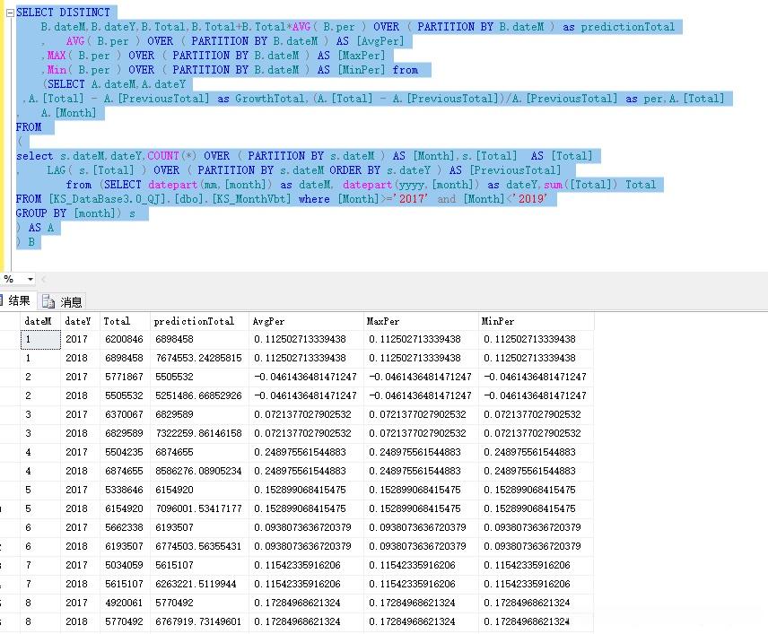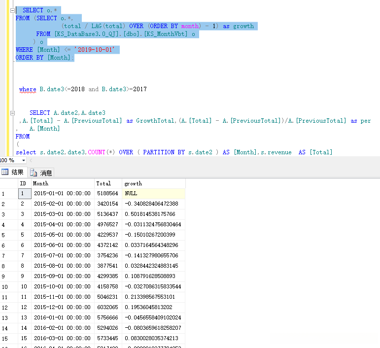 该查询选择所有字段(o.*),从包含基于月份顺序窗口函数计算增长情况的数据表中获取数据(KS_DataBase3.0_QJ 数据库中的 KS_MonthVbt 表)。其中窗口函数计算的是当前期间总值与上一期间总值之比减一的结果并赋值给字段 growth。此外还对结果进行过滤处理(过滤条件为月份小于等于2019年10月1日),最后按月份排序输出结果。