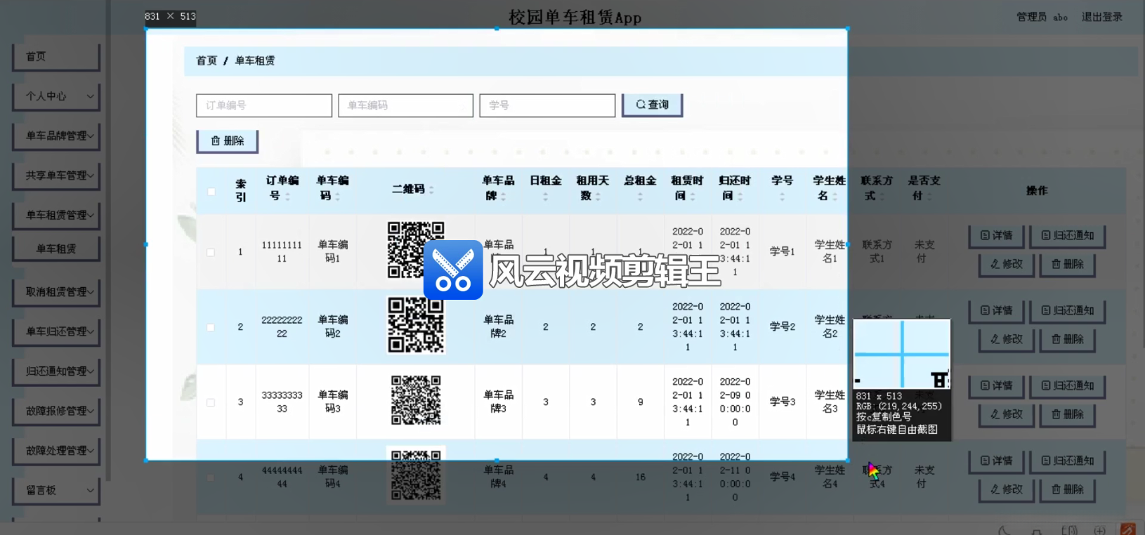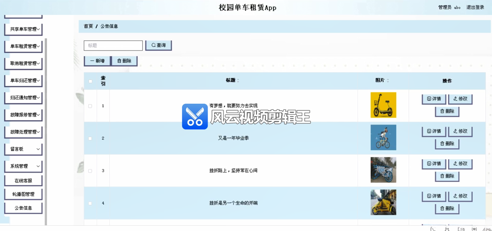 本研究的核心目标是开发与完善一款功能全面、操作简便且用户体验优异的校园单车租赁应用程序。该应用将允许学生用户方便快捷地完成单车租赁、归还及故障报修等操作流程,并通过智能调度管理以及故障处理功能提升系统的便捷性与效能。借助科技手段有效提升了系统的便捷性与效能,并将致力于促进校园绿色出行,并提高资源使用效率