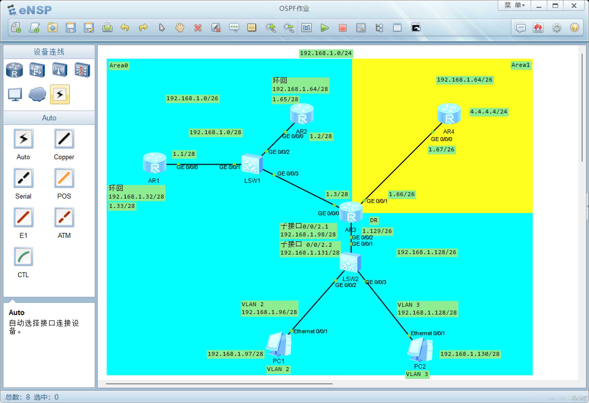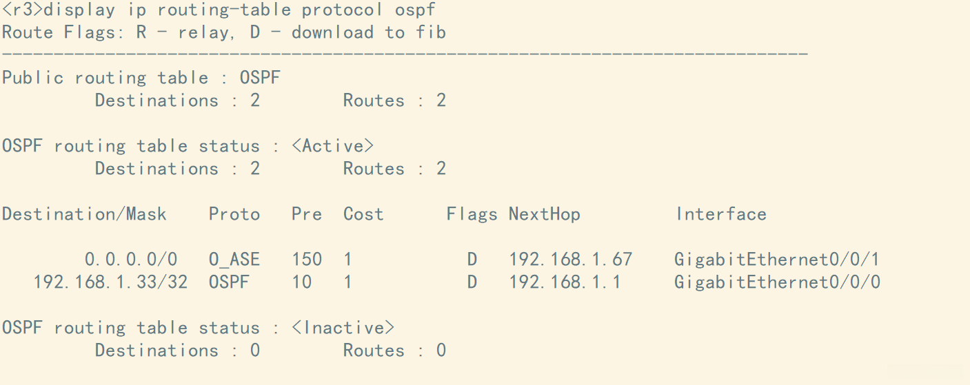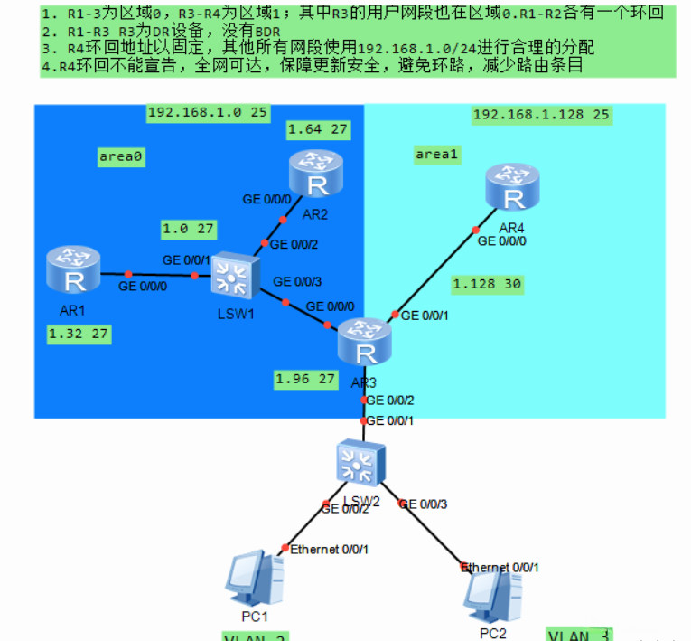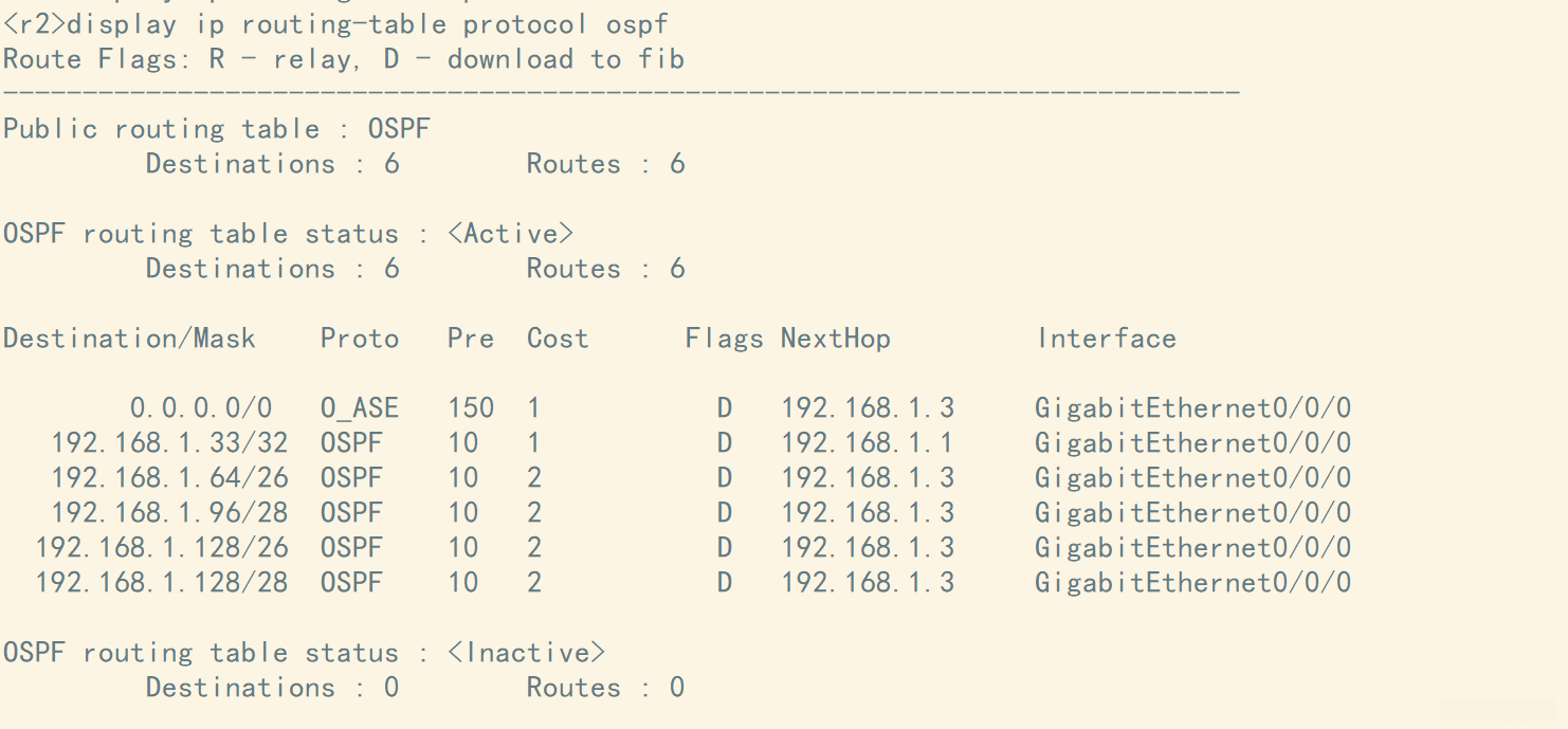 [r2-ospf-1-area-0.0.0.0]network 192.168.1.0 0.0.0.63-----宣告汇总后的网段192.168.1.0/26