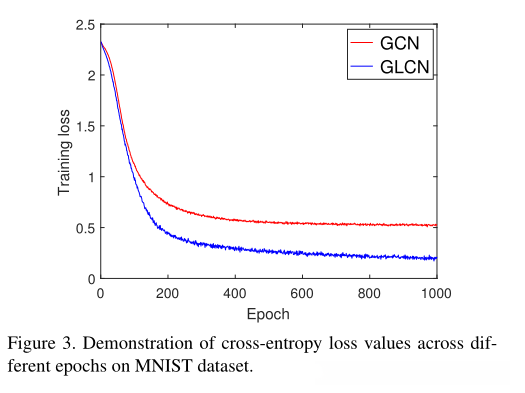 可以注意到,GLCN在收敛时获得的交叉熵值明显低于GCN,这清楚地证明了GLCN模型的较高预测精度。此外,GLCN的收敛速度略慢于GCN,这表明GLCN具有效率