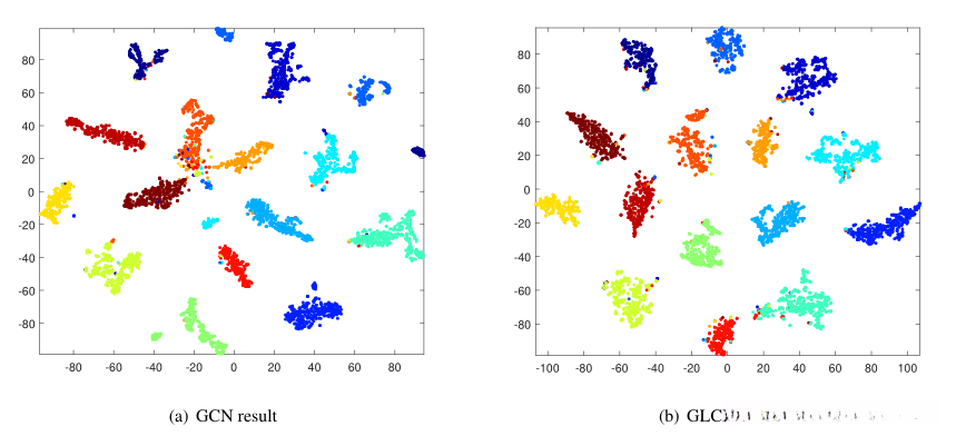图4分别展示了GCN[11]和GLCN的第一卷积层输出的特征图的2D t-SNE可视化。不同的类用不同的颜色标记。可以注意到,不同类别的数据在我们的GLCN表示中分布得更清晰、更紧凑,这证明了GLCN在执行图节点表示和半监督分类任务时所需的辨别能力。