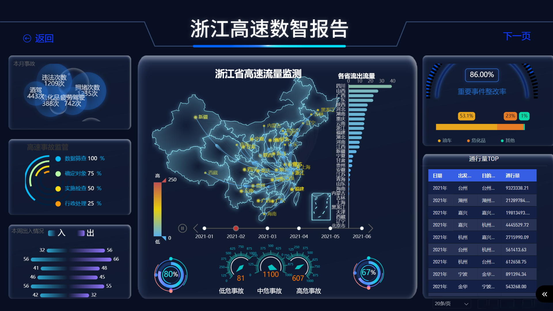 首先从整体上分析该页面的数据展示需求,在视觉呈现层面上主要体现两个核心要素:事故记录和通行量数据。通过驾驶舱监控系统界面设计,在半年度高速通行量数据的基础上,并通过地图形式直观呈现各省份间的出入流量分布情况。而其他则是与高速公路相关的事故记录进行汇总分析,目的是为后续的交通安全管理体系优化提供直观认知基础。