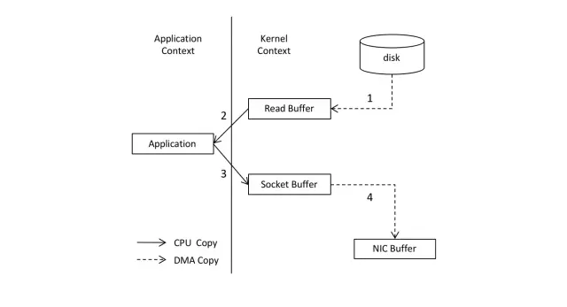 从上述分析可以看出,在内核模式与用户模式之间经历了完整的转换周期:首先发生了从内核模式到用户模式的一次完整转换(即第一次复制过程),随后又经历了一次从用户模式返回内核模式的过程(即第二次复制过程)。整个过程中涉及两次来回复制的操作:第一次是从内核到用户模式的复制操作;第二次是从用户模式返回到内核模式的逆向操作,在上述四步操作中分别对应第2步和第3步的操作步骤。值得注意的是,在这一过程中完成了四次不同方向的上下文切换过程:包括两次从内核到用户的切换以及两次从用户返回到内核的变化过程。