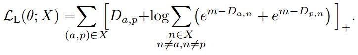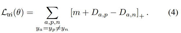 其中D_{a,p}和D_{a,n}分别代表锚点与positive样本以及negative样本之间的距离。通过triplet loss机制,锚点与同类样本的距离应显著小于异类样本的距离。其主要缺点在于,当训练数据规模极大时,几乎难以实现有效的学习效果.这是因为大量简单的(易区分)样例掩盖了具有挑战性的(半硬)样例的存在。