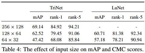 在 Market-1501 数据集上, pritrained model 取得了 rank-1=84.92% 的优异成绩, 经过 re-ranking 处理后, 进一步提升了至 86.67%. 相比而言, pretrained 的性能略高于 trained from scratch, 具体数值相差约 2%至3%. 需要注意的是, pretrained 模型在输入尺寸方面存在一定的限制, 如果对其进行修改可能会产生相反的效果(如表所示). 训练自_scratch 则无需此类限制, 因此其通用性更强