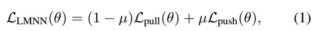 其中 L_{pull} 负责将属于同类别的样本进行聚拢,而 L_{push} 则致力于将不同类别间的样本拉开距离.基于所采用的是最近邻方法,因此在同类别中可能存在多个聚类区域.