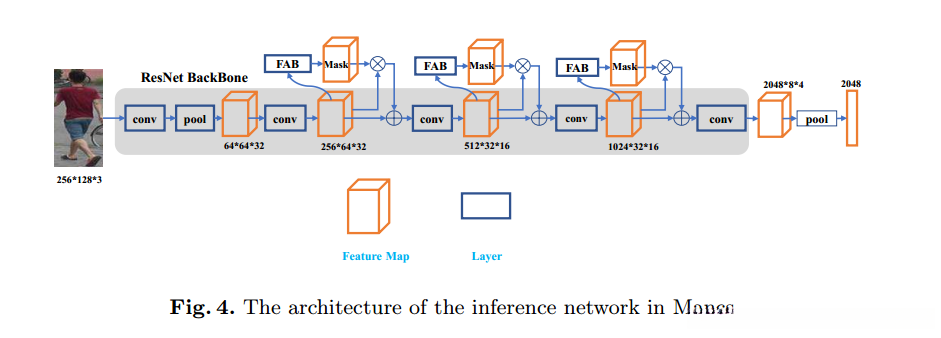 骨干网络充当多尺度特征提取器角色,在本研究中我们采用了ResNet-50架构,并通过conv-2、conv-3及conv-4模块分别提取不同尺度的空间特征进而生成注意力掩码;随后将这些掩码反馈至主干网络主体部分;经过最后一个 conv-5模块的深度学习训练后成功获取并输出人物的身份特征编码信息