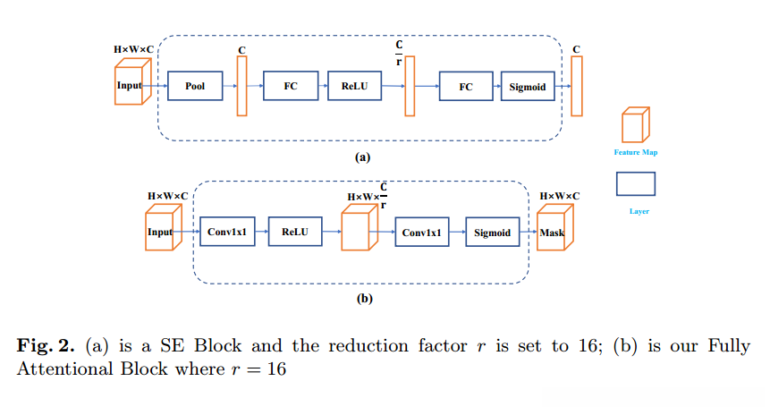 基于SENet的设计理念,在本方法中我们揭示了不同通道在特定对象上映射出特征的差异性。SENet中的SE模块(如图3-2(a)所示),通过为每个通道赋予相应的权重系数来实现选择性响应的调整。然而该模块仅对通道维度进行了响应校准,在全局平均池化操作下忽略了空间维度的信息提取。针对这一局限性,在本文所提出的FAB模块中我们放弃了池化层的设计,并采用1×1卷积替代全连接层以重新捕获空间信息。这样一来就能得到与输入特征图尺寸一致的注意力掩码矩阵(如图3-2(b)所示)。