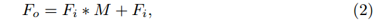 其中,在深度学习模型中使用*和+分别表示矩阵乘法与矩阵加法这一操作过程。这表明将注意力机制应用到原始特征图中以突出其独特的属性。在这种情况下(即FAB),我们可以灵活地选择是否加入注意力机制到现有网络架构中。值得注意的是,在这一过程中(即FAB),卷积特征映射的大小保持不变