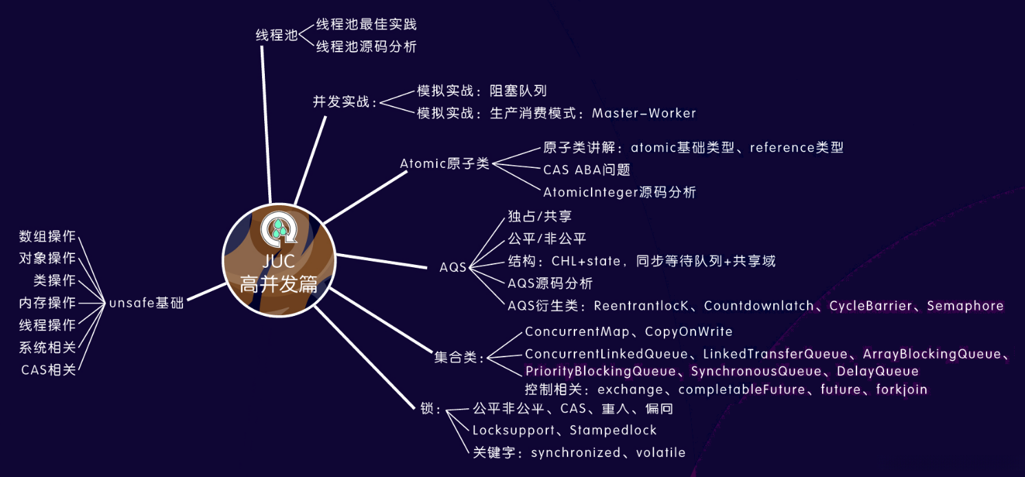 本章重点旨在提高学生应对高并发任务的能力,并通过优化设计确保系统的高效运行。具体而言, 通过实现"把所用户的访问请求都尽量往前推"这一目标, 使系统能够更好地处理大量并行操作带来的挑战。本章节将深入探讨JUC高级篇章(包括Unsafe类, Atomic块, 线程池机制, 锁机制, AQS同步通道, 关键字同步等)以及网络编程领域的核心内容(如Netty框架应用与Websocket开发)。整个章节将分为两个核心模块进行讲解。