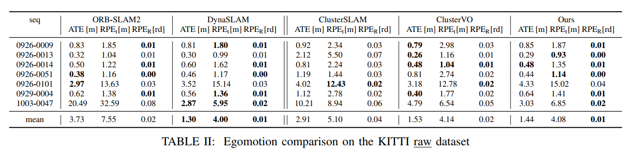 最后,在表V中汇总了KITTI数据集中协同工作完成SLAM与多物体跟踪系统的平均运行时间数据。仅此一家的DynaSLAM II 专为实现实时性能优越的任务而设计。