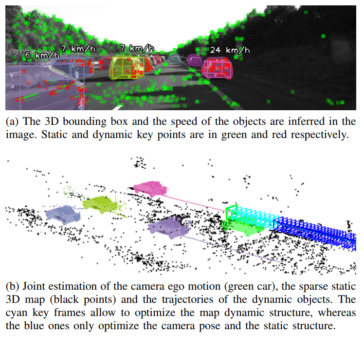 现有文献中的几种方法所认为的是到目前为止对动态目标的跟踪已经相当完善。即,在场景中的每个动态目标上都估计了一个质心轨迹以及一个点云表示。这些工作的实例包括ClusterSLAM [25]和VDO-SLAM [13]。然而我们强调的是在同一语义类别对象中找到共同的空间参考及其尺寸与空间占用估计的重要性。相反基于物体边界框的基础研究如CubeSLAM [11]与Li等人工作 [10]则关注于在检测到边界框后进行物体追踪这一过程。值得注意的是如果相机视角受限无法估计物体边界框(部分视图)则不进行物体追踪这一做法对于Li等人而言不成问题因为CNN天然具备对物体部分视图的鲁棒性但CubeSLAM在初始化被遮挡物体的视图时仍存在困难