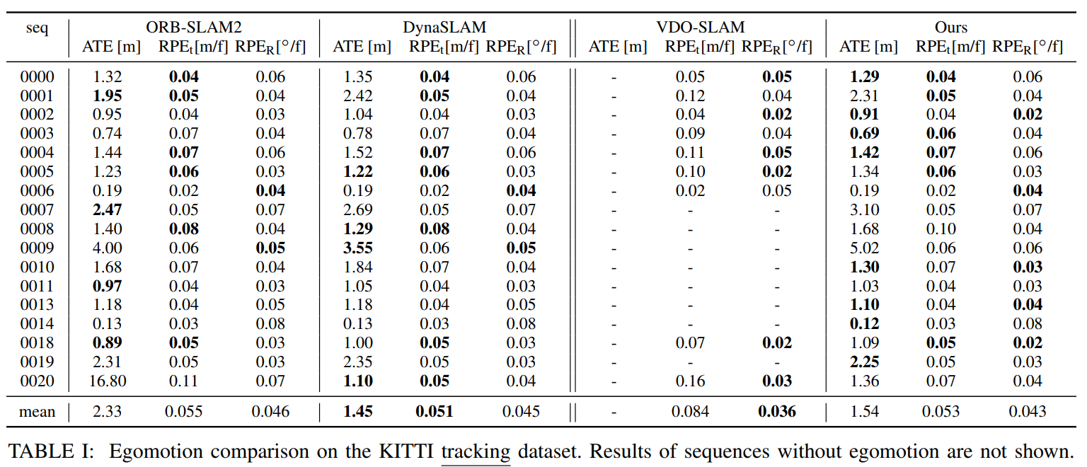 表格 I 和 II 展示了我们的自我运动结果与其他在联合 SLAM 框架中追踪动态物体的最新系统结果进行比较。其中 ClusterSLAM [25] 作为后端使用的 SLAM 系统,严重依赖于相机姿态的初始估计。另外,ClusterVO [12] 和 VDO-SLAM [13] 是与我们类似的多目标跟踪能力 SLAM 系统,其中前者能够处理立体视觉和 RGB-D 数据,而后者仅能处理 RGB-D 数据。报告中的误差数值采用不同的度量指标给出,以便我们可以直接使用作者提供的值。在所有序列中,DynaSLAM II 在所有序列中的平移相对误差 (RPEt) 均低于 VDO-SLAM.然而,在大多数情况下,VDO-SLAM 能够实现较低的旋转姿态误差.由于远距离点提供了最丰富的旋转估计线索,我们认为这种精度差异不取决于物体追踪性能,而是取决于底层相机姿态估计算法和传感器套件.对于 ClusterVO 的性能评估而言,其在大多数序列中的准确率与我们的方法相当.