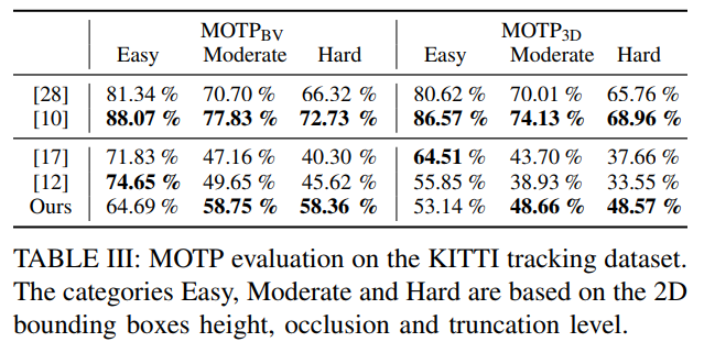 表 III 展示了 KITTI 跟踪数据集中所有目标检测的评估结果,并基于 KITTI 3D 目标检测基准进行了计算(表 III)。Chen 等人 [28] 的卷积神经网络基于单视角网络准确性本身表现突出,并且结合多视角细化方法取得了出色的结果;但以泛化性能为代价。Li 等人 [10] 的研究进一步验证了这一结论。相比之下, Barsan 等人 [17] 和 Huang 等人 [12] 在边界框检测方面的准确率非常高,但他们对被截断或遮挡的目标表现得不够稳健.我们的实验表明,在仅接受少量精度损失的前提下,我们能够有效地处理被截断或遮挡的目标.然而,通常只能捕获较少数量的有效边界框.这与我们系统的特征性质所决定的独特性相矛盾:与 Barsan 等人的工作 [17] 不同,他们首先基于立体匹配计算稠密对应关系